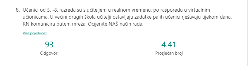 Anketu je ispunilo 93 roditelja naših učenika od 1.do 8. razreda. Roditelji su našu organizaciju nastave (počinjemo prilično rano kako bismo izbjegli poteškoće u sustavu koje nastaju istovremenom prijavom velikog broja korisnika te nastavu izvodimo u realnom vremenu ) ocijenili ocjenom 4,23, dok ste komunikaciju s razrednicima ocijenili ocjenom 4,38.