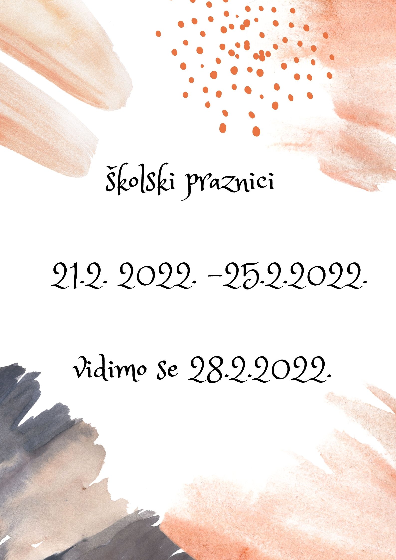 drugi dio zimskih praznika za učenike počinje 21. veljače 2022. godine i završava 25. veljače 2022. godine, a nastava počinje 28. veljače 2022. godine prema uobičajenom rasporedu.