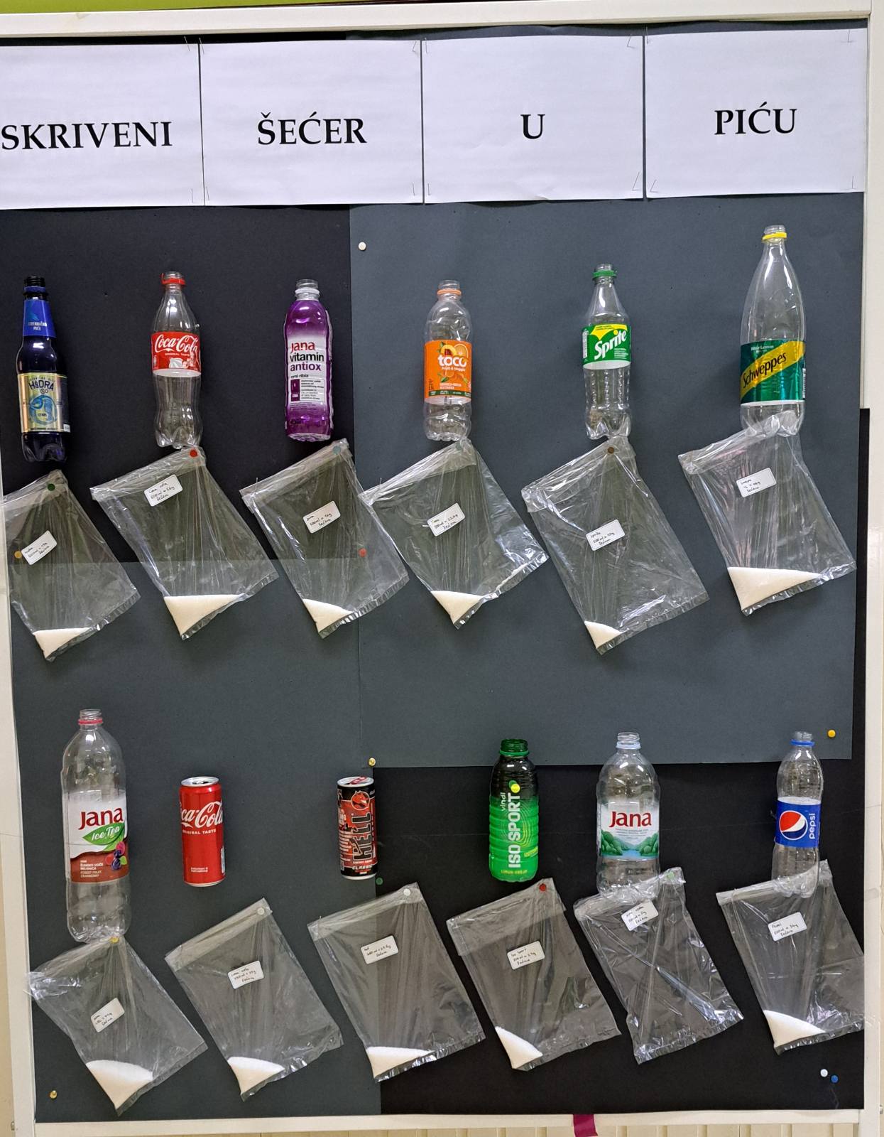 Učenici petog razreda na Satu razrednika sudjelovali su u radionici u kojoj je cilj bio otkriti koliko šećera sadrže sokovi koje vole piti.Učenici su tijekom tjedna ostavljali prazne boce ispijenog soka. Također, tijekom tjedna zapisivali su na papir što najviše vole piti i za koje piće smatraju da ima najviše šećera. Naučili su da da bismo ga radi niza zdravstvenih problema trebali izbjegavati u što širem luku. No, šećer je svuda oko nas, od kechupa do maslaca . A omiljeni sokovi? Aktivno su preračunavali količine šećera, uspoređivali, vagali, pisali i lijepili rezultate. Cilj je ostvaren: većina se jako začudila koliko šećera ima npr. boca omiljene coca- cole ili Jane.Zaključak je da je najbolje piti vodu. Ako će barem jedan učenik promijeniti svoje navike te umjesto soka ujutro piti vodu, naša radionica je uspjela! Više fotografija pogledajte OVDJE.