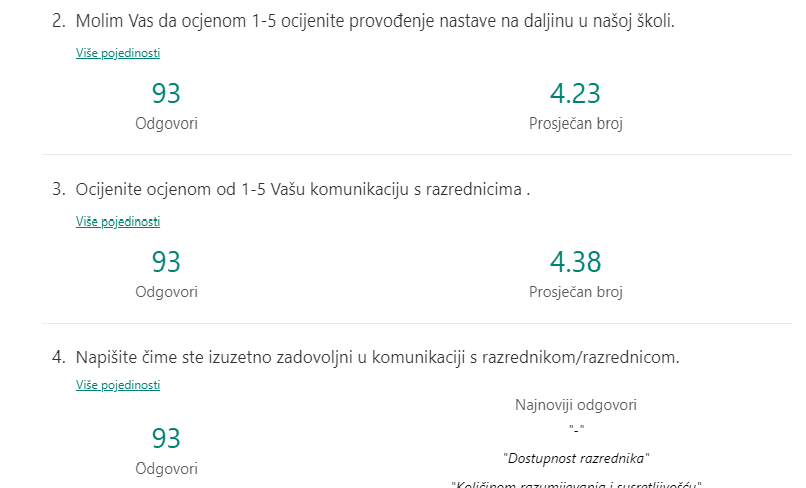 Anketu je ispunilo 93 roditelja naših učenika od 1.do 8. razreda. Roditelji su našu organizaciju nastave (počinjemo prilično rano kako bismo izbjegli poteškoće u sustavu koje nastaju istovremenom prijavom velikog broja korisnika te nastavu izvodimo u realnom vremenu ) ocijenili ocjenom 4,23, dok ste komunikaciju s razrednicima ocijenili ocjenom 4,38.