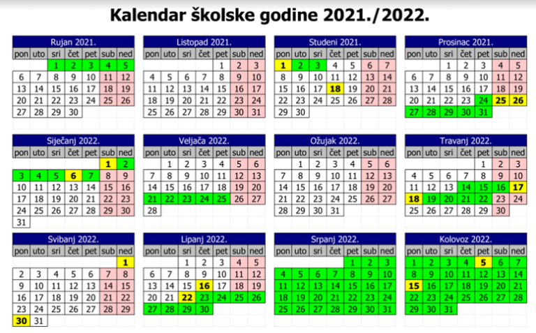 Nastavna godina počinje 6. rujna 2021. godine, a završava 21. lipnja 2022. godine.