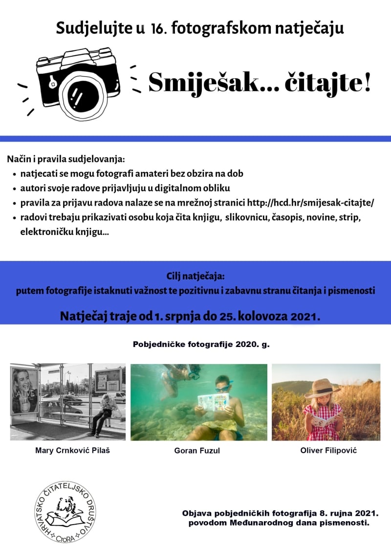 Tisuću riječi, jedna fotografija bila je misao vodilja pri pokretanju fotografskog natječaja Hrvatskoga čitateljskog društva čiji je osnovni cilj putem fotografije promovirati knjigu, čitanje i sve vrste pismenosti na pozitivan, zabavan, pa čak i humorističan način. Na osnovu toga, naslov se gotovo nametnuo sam od sebe: Smiješak… čitajte!.