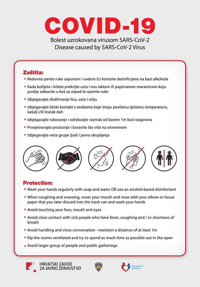 Napominjemo da osobe, koje su unazad 14 dana boravile u gore navedenim zahvaćenim područjima te razvile respiratorne simptome, nikako ne smiju ići u odgojno-obrazovne ustanove te se odmah moraju javiti svom izabranom liječniku.