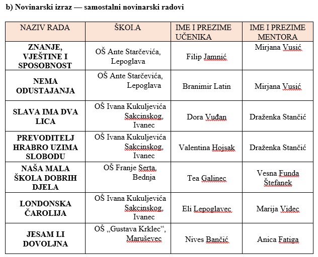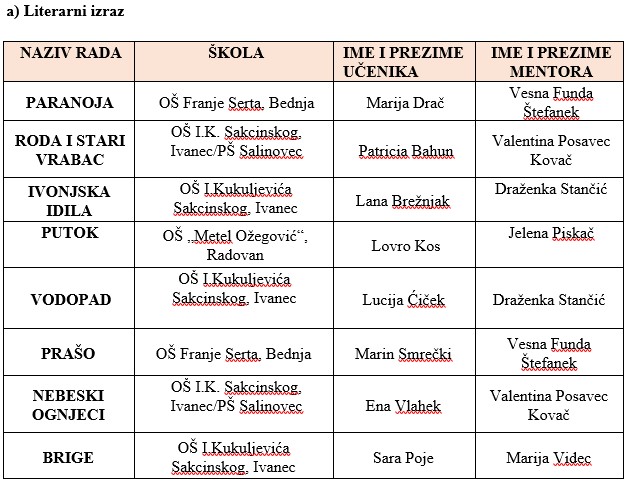 Od pojedinačnih nastupa na županijsku se smotru plasirala Ana Šipek, OŠ Andrije Kačića Miošića, Donja Voća (mentorica: Dubravka Tuđan), Ana Ferček iz OŠ Franje Serta iz Bednje ( mentorica: Emilija Maligec-Zagrajski), Petar Magaš i OŠ Ivanec (mentorica: Silvija Čavlek), Marko Maltarić iz Područne škole Cvetlin (mentorica: Sanja Latin) i Laura Barbir iz OŠ I. Rangera (mentorica: Tamara Rešetar).