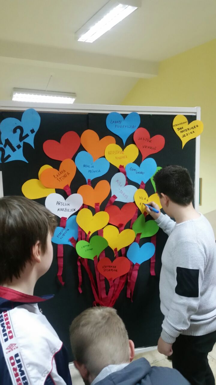 Taj dan su obilježili i učenici petog razreda zajedno s knjižničarkom i učiteljicom hrvatskog jezika. Nakon što su se prisjetili što je to materinski jezik i po čemu se razlikuje od standardnog, na panou su zapisali neke riječi koje koriste u svakodnevnom govoru, a čiji se nazivi uvelike razlikuju od standardnih oblika.